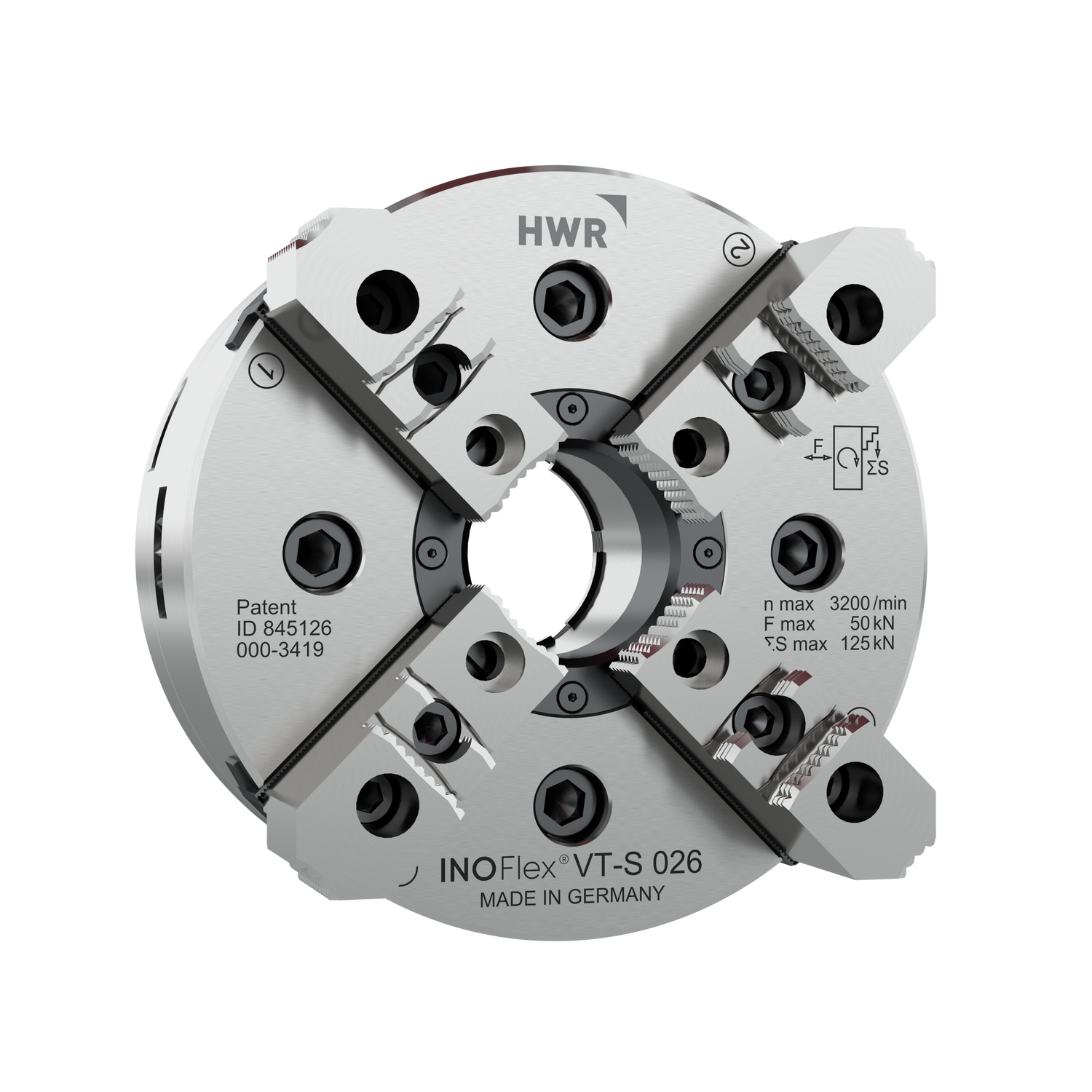 HWR社の補正機能付き4つ爪チャック/バイスでは、円形、角材、不定型ワークを補正して同心円状にクランプすることができます。4つ爪バイスは96mmピッチ クイックチェンジシステム適合。